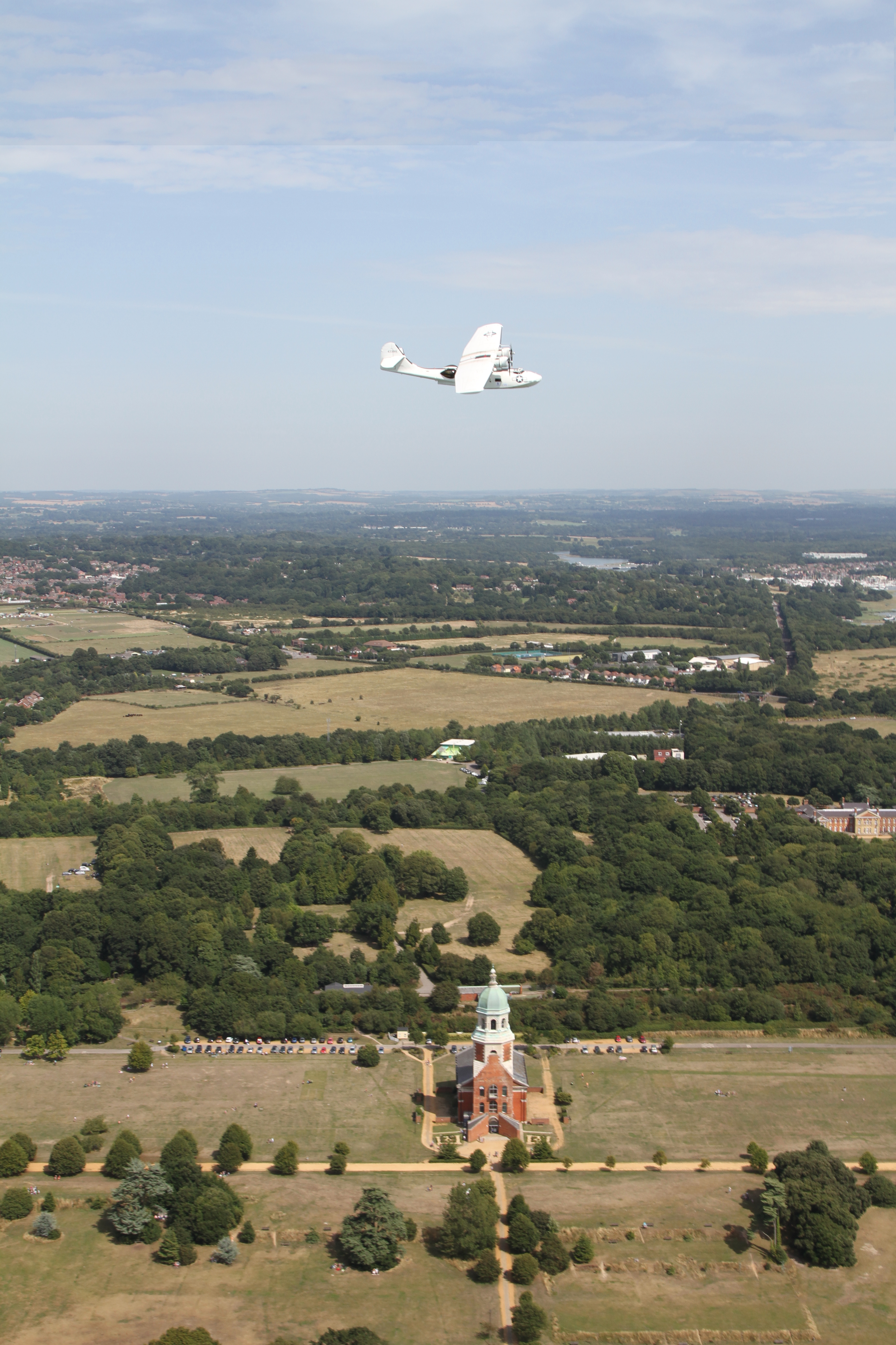 The headlands around Poole were covered in patchy cloud but the Catalina was able to fly along the shoreline of Poole Harbour, well known for its flying boat history. Shortly afterwards and despite the haze, a camera ship flown by Jon Butts and with Karl Drage behind the camera came alongside. It was planned to do some more air to air shots as the Catalina flew past the Needles and the southern coastline of the Isle of Wight before heading up Southampton Water. By this stage Solent Radar and then Southampton ATC were providing a very helpful service to both aircraft.